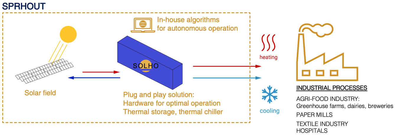 SPRHOUT è un innovativo impianto di energia solare termica. Raccoglie l’energia solare sotto forma di calore e la immagazzina. L’energia immagazzinata viene prelevata quando è necessario per riscaldare il processo industriale e/o per essere convertita in raffreddamento per mezzo del refrigeratore termico. Il funzionamento autonomo è garantito da algoritmi di controllo interni.